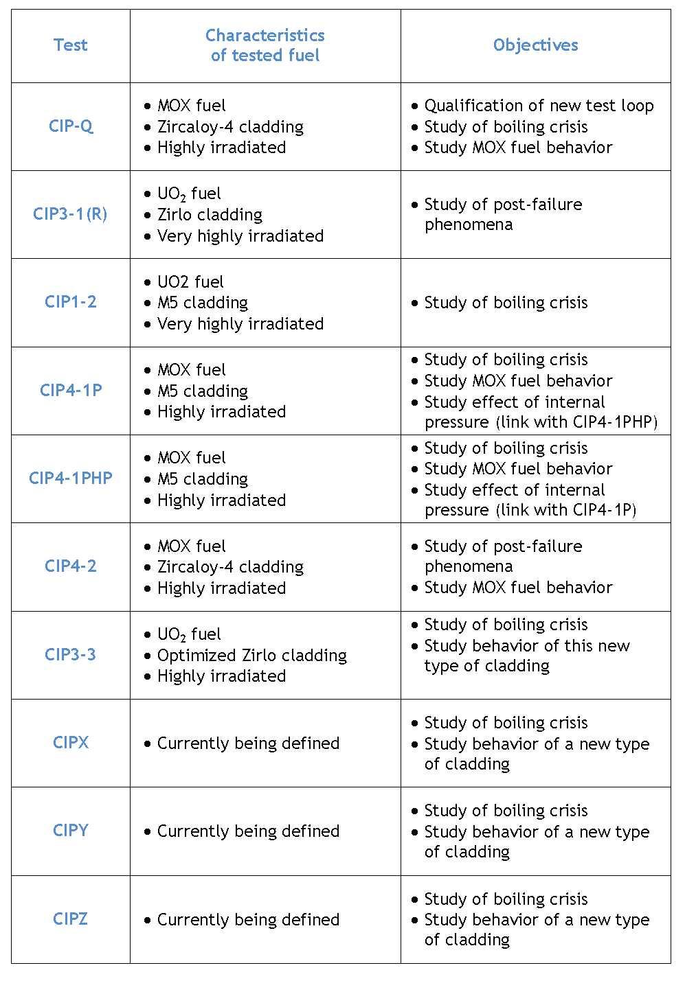 However, to study accident conditions in a PWR (phase post-DNB and fuel-coolant interaction in the event of cladding failure), the "sodium loop" had to be replaced by a pressurized water loop. The renovation of the reactor core cooling system, as well as the remediation work to bring the facility into compliance, have been completed. The following ten tests in the program consist in exposing the sections of irradiated fuel to conditions found during a reactivity injection accident. The following table lists the characteristics of the fuels that will be tested and the main objectives of each of the tests