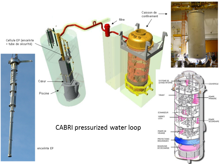The pressurized water loop thus constitutes the first safety barrier of the facility with regard to the rod being tested. The part of the pressurized water loop located at the center of the reactor is termed the in pile pressurized water cell. It is connected to the out of pile containment vessel which houses all of the components producing PWR thermal hydraulic conditions (pressurizer, circulation pump, heat exchangers) and the related systems of the pressurized water loop (relief tank, systems for managing liquid and gas effluent generated during testing, etc.).