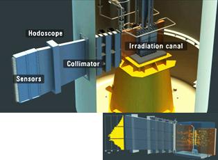 The hodoscope is located in the axis of the reactor core. The collimator channels neutrons from the test fuel to the detectors. The collimator crosses the reactor pool inside a leaktight sleeve towards the test cell in which the test fuel is located. Rotations of the collimator are used to align it on the test rod. Its characteristics: 3 meters long, 5 metric tons and the front side of the collimator is 1,020 mm from the core axis.