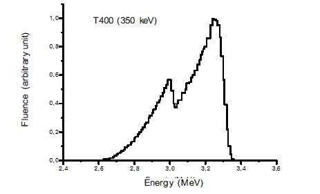 The main function of this generator is to supply high neutron fluxes of a few MeV. T400 nominally operates at an energy of 350 keV with a beam intensity of 2 mA. The target used is a thick target that completely stops the beam of charged particles. The deuteron beam is polluted by around 20% diatomic ions. This results in a neutron energy distribution consisting of two quasi-monoenergetic peaks with a full width at half maximum of several hundred keV, overlapping one another as shown in the figure on the right.