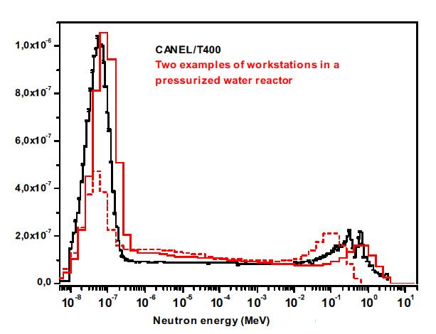 CANEL is used to create realistic neutron fields. These have two major advantages. The first is that they can be used to test instruments in an environment similar to real conditions (wide energy distribution, significant contamination with photons, variable neutron incidence angles, etc.), in full knowledge of the field’s characteristics. The second is that they can be used to calibrate radiation protection equipment in a neutron field that, at least in terms of energy distribution, is representative of the workplace where it will be used, as shown by the graph below, and they therefore enable a calibration coefficient to be defined that reflects the actual use of the instrument.