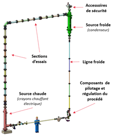 • A thermal-hydraulic loop, called ALCINA for ‘AnaLyse de la CIrculation NAturelle’ (Analysis of Natural Circulation), the aim of which will be to determine the losses of pressure in a pipe, in forced convection (with pump) and in natural circulation, in single phase or in two-phase in incidental or accidental situations.