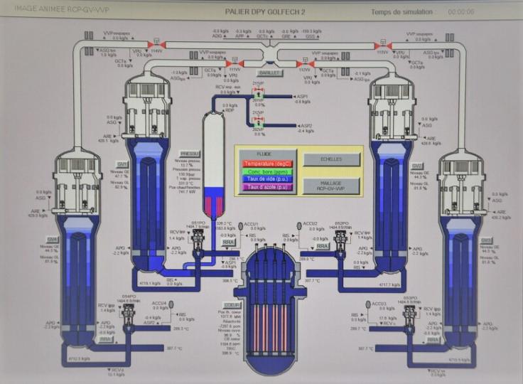 SOFIA simulator (Simulateur d'Observation du Fonctionnement Incidentel et Accidentel) - Observation of the CATHARE animated image of SOFIA during a breach accident on the primary circuit on the 1300Mwe stage - © Médiathèque IRSN